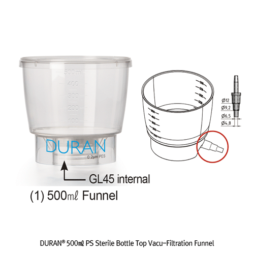 DURAN® 500㎖ PS Sterile Bottle Top Vacu-Filtration Funnel, with GL45 Internal Threaded, Pore Size 0.1~0.45㎛ PES FilterGood for All of GL45 Threaded Bottle and DURAN® Tilt GL56 Bottle, 멸균 진공 여과 장치/바틀탑 필터